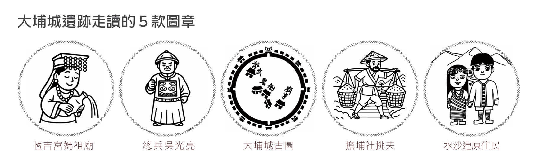 本系列活動還特別設計一張大埔城的導覽地圖和集章頁。集章有 5 款,是由水沙連雜誌社的編輯設計出來的,圖樣包括:四城門、媽祖婆、總兵吳光亮、原住民、挑夫,採 Q 版設計,活潑可愛,大受好評。學員依線索解謎、蒐集城門印章,完成任務者可兌換埔里鎮公所提供的精美禮物。第二、三場又加碼導覽功能,善用 LINE@ 以互動問答方式,用心蒐集老照片與現地的對照,將昔與今的變化呈現在學員面前。